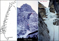 Orkanski veter je vso noč čistil okrog osemsto metrov visoko steno nad nama, glavnina snega se je nabirala v žleb, pršni plazovi so vozili po neuradnem voznem redu. Dejansko sva celo noč čistila sneg in skrbela, da se v pršnem snegu ne zadušiva. Mraz blizu dvajset pod nulo, nama je trdil noge v enojnih usnjenih čevljih in nama dal vedeti, da lahko dobro omrzneva. Še v temi sva zgodaj zjutraj pospravila zmrznjeno bivak vrečo in se s tresočim telesom lotila plezanja proti gor… Žleb se je višje položil, prečkala sva »Levo Ceklinovo smer« in nadaljevala po žlebu do konca pod skalno zaporo, s katere sva se po strmem svetu prebijala desno na rob, do stika z varianto Juvan-Sazonov, kjer sva novo smer zaključila.