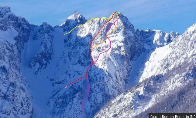 Smeri: 1 Sestopna smer ( II do III), 2 Smer prvopristopnikov ( II), 3 Smer prvopristopnikov z izstopno varianto ( IV-), 4 Smer Sara ( M5), ? Jeklenice ( Zahteven prehod skozi širok kamin...)