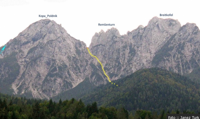 Z rumeno barvo je na fotografiji označena možnost sestopa z velike škrbine med Kopo in Remšenturnom proti Mangartski-Jezerski dolini.