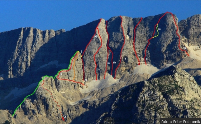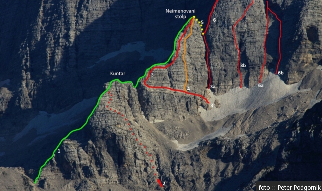 Smeri: 1 Smer po SV razu do NS (III/II), 2 Smer S. Liessi (IV/II-III), 3 Smer brez imena (IV), 3a Šmrkelj heca in razsodbe ( III/5), 3b Trajnostni alpinizem ( IV/5-), 4 Smer Pascoli-Rossi (IV/III), 5 Smer Simonetti (AG/Buscaini-171) (II+), 6 Severovzhodni greben (AG/Buscaini-170a) (III/II), 6a Rizzotti-Ferigo ( spodaj 85°/70°), 6b Rizzotti-Berra ( spodaj 85°/70°), 7 Levi steber (AG/Buscaini-169d) (V), 7a Smer za Pajka ( IV/4+), 8 Kardan (IV/4+), 8a GV Kardana (IV), 9 Desni steber (AG/Buscaini.169c) (IV+/IV)