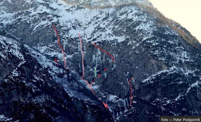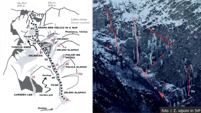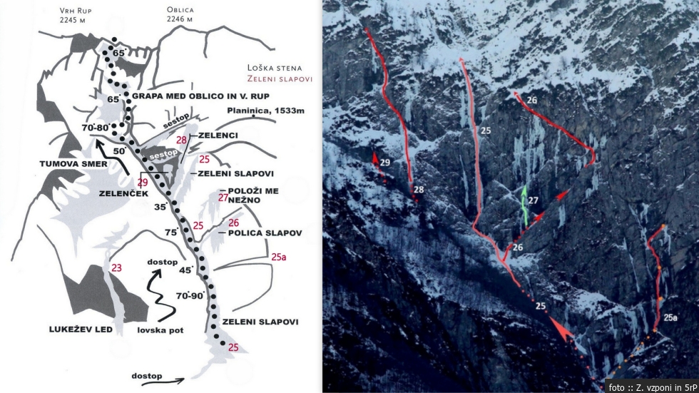Smeri: 25 Zeleni slapovi ( III/4-5), 25a Bratstvo in cepini ( M7), 26 Polica slapov ( III/3), 27 Položi me nežno ( III/6), 28 Zelenci ( III/5), 29 Zelenček ( III/5)