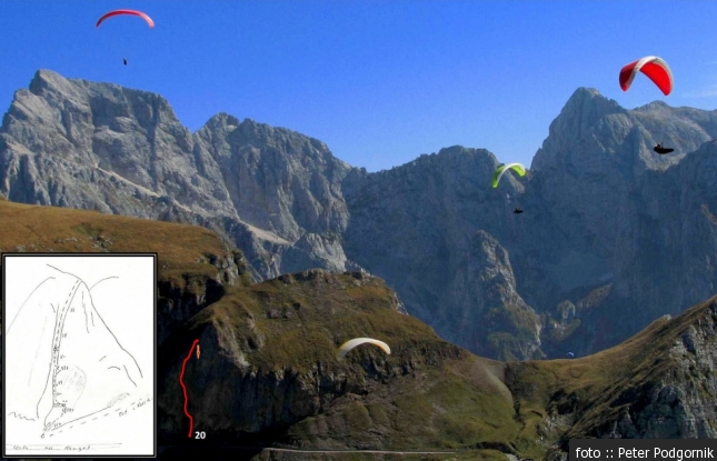 Na sedlu med Rdečo skalo in Malim vrhom je priljubljeno vzletišče jadralnih padalcev z eno lepših naravnih katedral v ozadju.