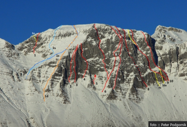 Smeri: 1 Fon – Kutin (IV/II-III), 1a Varianta Fon-Kutin (III+), 1b Jugozahodna (V), 1c Smučarska ( T), 1d Rehabilitacijka (65°/55°-skok), 2 Lepa smer (V+/III-IV), 3 Zahodni steber (IV), 4 Desno od Z stebra (III-IV), 5 Rakušček/Nikolič (III-IV), 6 Osrednja grapa (II-III), 7 Levo od Osrednje grape (II-III), 7a Južni raz (IV-/II-III), 8 Levo od V stebra (VA0/III-IV), 9 Šrapnel (IV/50°), 9a Vstopna in iztopna varianta (V+), 10 Vzhodni steber (V/IV), 10a Vstopna varianta (IV)