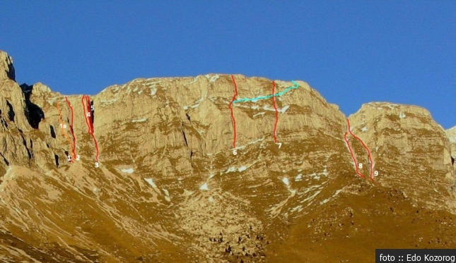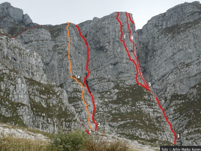 Smeri: 1 Lovska smer (II-III), 1a PŠ_ZA ( IV+), 2 Petnajstarca ( V-/II-IV), 3 Kapitan-Kurinčič-Rakušček (V/II-III), 3a Smer sv. Roka (VI-), 4 Sončni steber (VI+/VI), 5 Kapitan-Koren ( V+/IV-V), 6 Zajeda ( V/IV), 7 Nedeljski kamin (II-III), 8 Leva grapa (40°-45°), 9 Desna grapa (40°-50°)