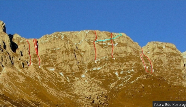 Smeri: 1 Lovska smer (II-III), 2 Petnajstarca ( V-/II-IV), 3 Kapitan-Kurinčič-Rakušček (V/II-III), 3a Smer sv. Roka (VI-), 4 Sončni steber (VI+/VI), 5 Kapitan-Koren ( V+/IV-V), 6 Zajeda ( V/IV), 7 Nedeljski kamin (II-III), 8 Leva grapa (40°-45°), 9 Desna grapa (40°-50°)
