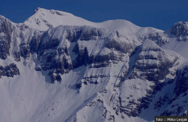 Opis: Gora mizaste oblike, brez izrazitega vrha sredi verige gora nad vasjo Krn. Razdrapano steno krasijo na sredini veliki napušči – strehe, imenovani Zvonovi. Na levi strani pod Batogniškim sedlom se boči izrazit steber, kjer so speljane smeri dveh generacij drežniških in mlajših kobariških plezalcev. Dve grapi, ki prideta iz smeri planine Leskovca, se pod vrhom združita v eno in zaključujeta na desni steno Srednjega vrha v škrbini, odkoder gre naprej greben proti Malemu vrhu.