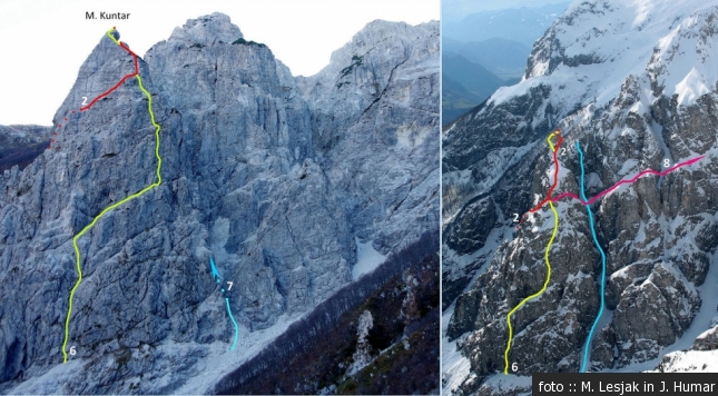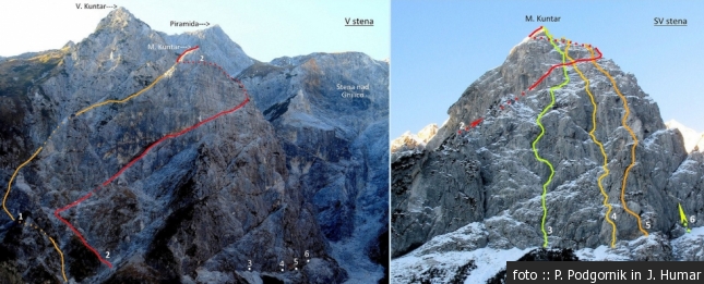 Smeri: 1 Sestopna smer (III/II), 2 Lovska smer (IV-/II do III), 3 Direktna (V+/III do IV), 4 Baškograpska (V/II do IV), 5 Smer Žagar – Skubin (V/II do IV), 6 Spominska smer (IV+/III do IV), 7 Grapa med M. in V. Kuntarjem (V), 8 Prečenje sten obeh Kuntarjev (III/II)