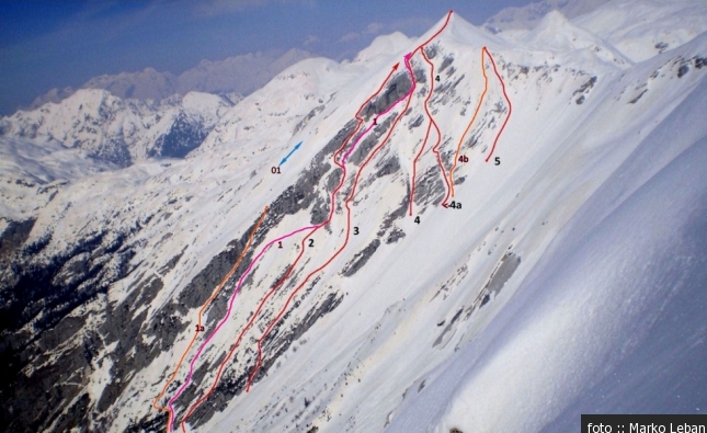Smeri: 01 Zahodno pobočje (30-45°), 1 Smer za Lucijo ( 85° / 40° do 70°), 1a Pološka smer ( 50°/45°), 2 Julija (M3+/70°/ 45 do 60°), 3 Smer za prijatelje (85°/40 do 70°), 4 Ančkina smer (90°/ ostalo največ do 60°), 4a Vstopna varianta (70°/40-50°), 4b Antivirus ( 45°), 5 Čaromanka (50°/40°)