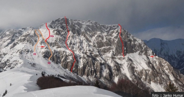 Smeri: 01 Leva (sestopna) ( 35-40°), 02 Desna ( 40-45°), 02a JV vesine ( 40-45°), 1 Lovska smer (II do III), 2 Pastirska (IV), 3 Jordanova (V+/IV), 4 Grapa (III)