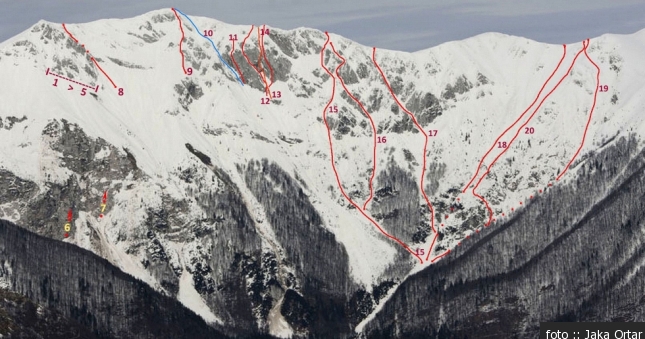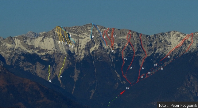 Smeri: 1 Levi steber (V-/IV), 2 Južni raz (IV/II-III), 3 Smer premrlih prstov (IV+/II-III), 4 Larisina smer (IV+/III ), 5 Prodenska smer (IV/II do III), 6 Kontrabant (VI (V), 7 Klinček (V), 8 Jernejeva grapa (50°/40°), 9 Modre oči (55°/45°), 10 Smučarska (III+), 11 Vitez skaloljub (IV+/III-IV), 12 Sebastjanova rampa (IV-/II-III), 13 Obkaminska (IV+/III), 14 Smer fižolovih vetrov (IV+/ III-IV), 15 Smer za alpinistične mazohiste (IV-/II-III), 16 Smer za alpinistične uživače (IV-/II-III), 17 Smer Zoisovih zvončic (IV-/I >III), 18 Grapa za vrtičkarje (30 do 40° ), 19 Desni graben (30 do 45°), 20 Smer za Mirana (60°/30-45°)