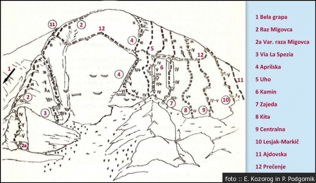 Smeri: 1 Bela grapa (IV), 2 Raz Migovca (III/II), 2a Varijanta (V/IV), 3 Via La Specia (VI+ A1/V+ (PP VII-)), 4 Aprilska (VI-/IV-V), 5 Uho (V+), 6 Vse dol visi (Kamin) (V/IV), 7 Zajeda (IV), 8 Kita (V/IV+), 9 Centralna (V-/IIV), 10 Lesjak – Markič (V- A1), 11 Ajdovska (IV/III), 12 Prečenje (IV/II-III)