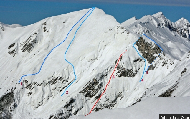 Smeri: 1 JV pobočje-levo (II+), 2 JV pobočje-desno (T-), 3 Grapa v Merniku (50°/30-40°), 4 Mlečna pot (V), 5 Skrita grapa (IV-), 6 Južna grapa ( IV-), 7 Neznanka (III)