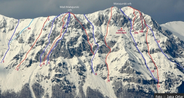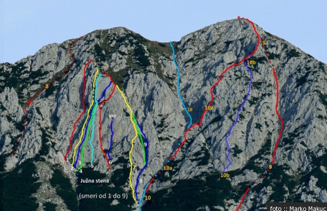 Opombe: Fotografija v kopnih razmerah prikazuje vrhnji del jugozahodne stene Matajurskega vrha. Smeri od 1 do 9, označene z belo barvo najdeš v poglavju Južna stena.